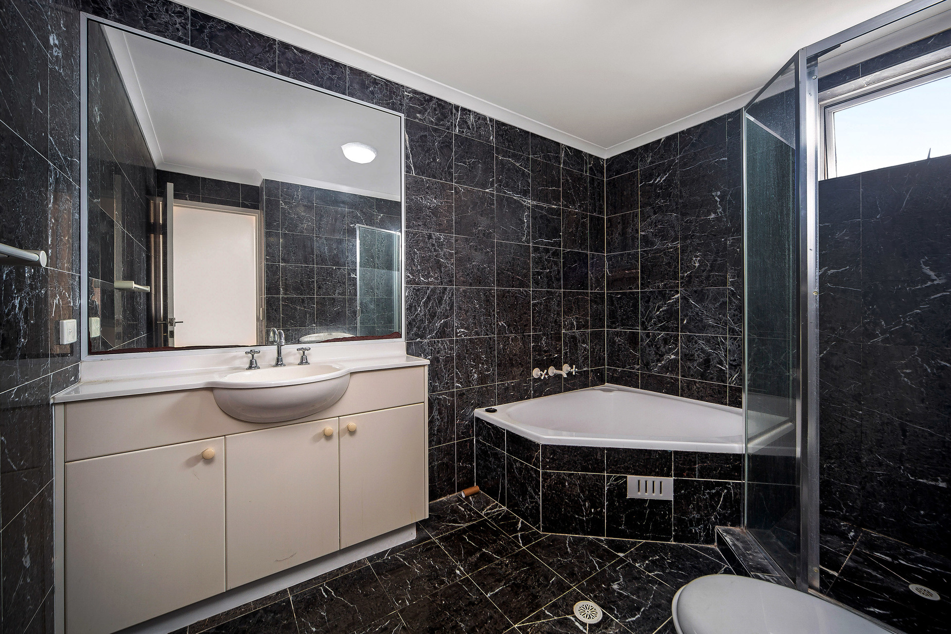 – Modern designed bathroom with dark tile finish