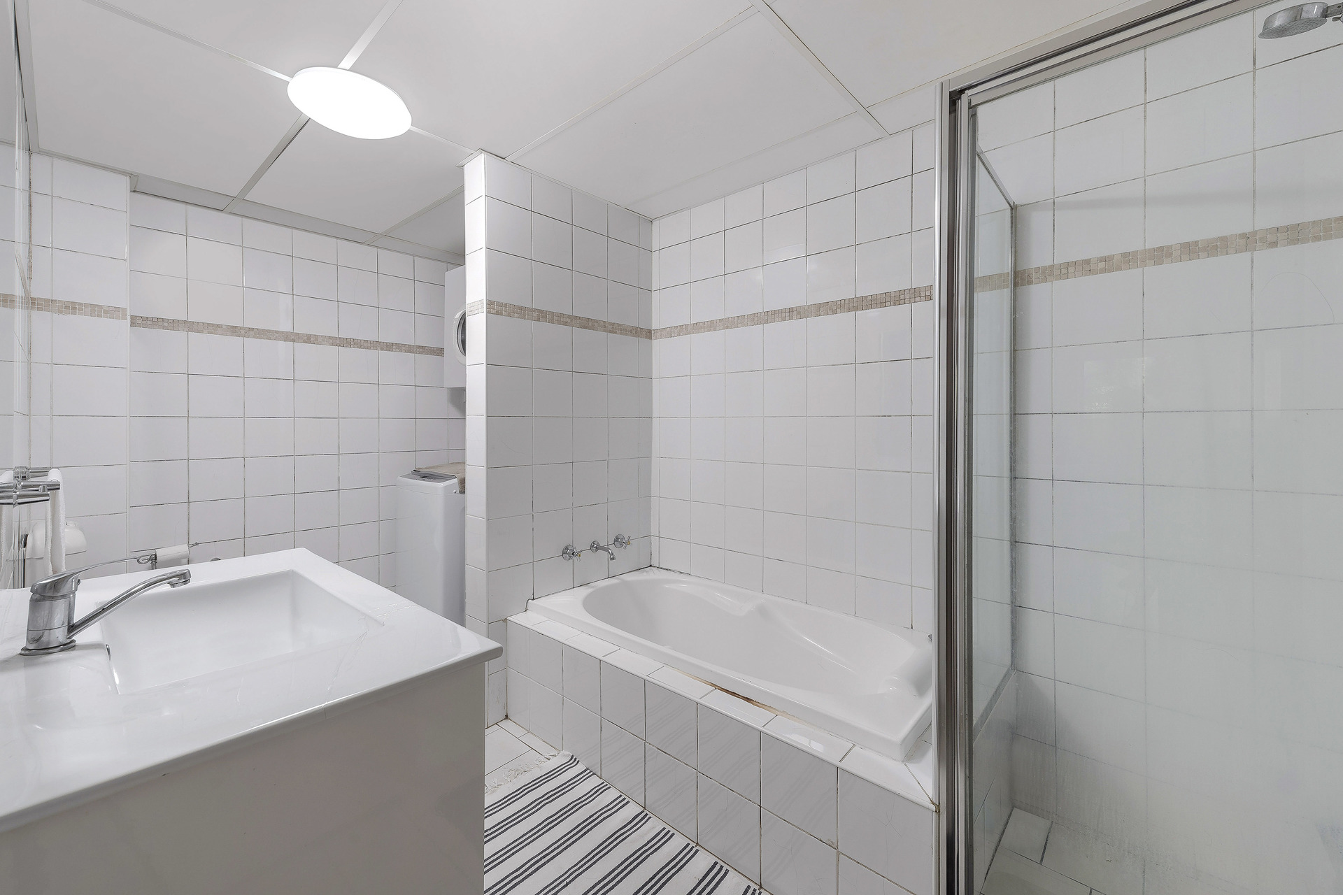 * Modern bathroom with floor to ceiling tiles and separate shower and bath