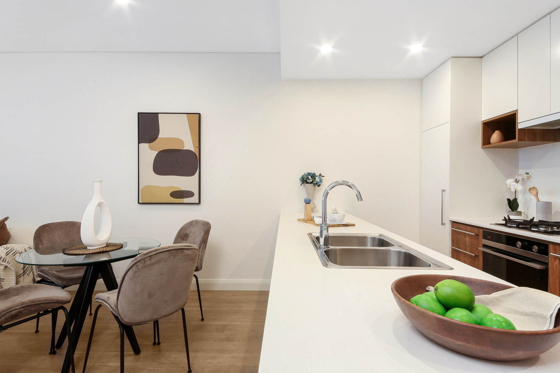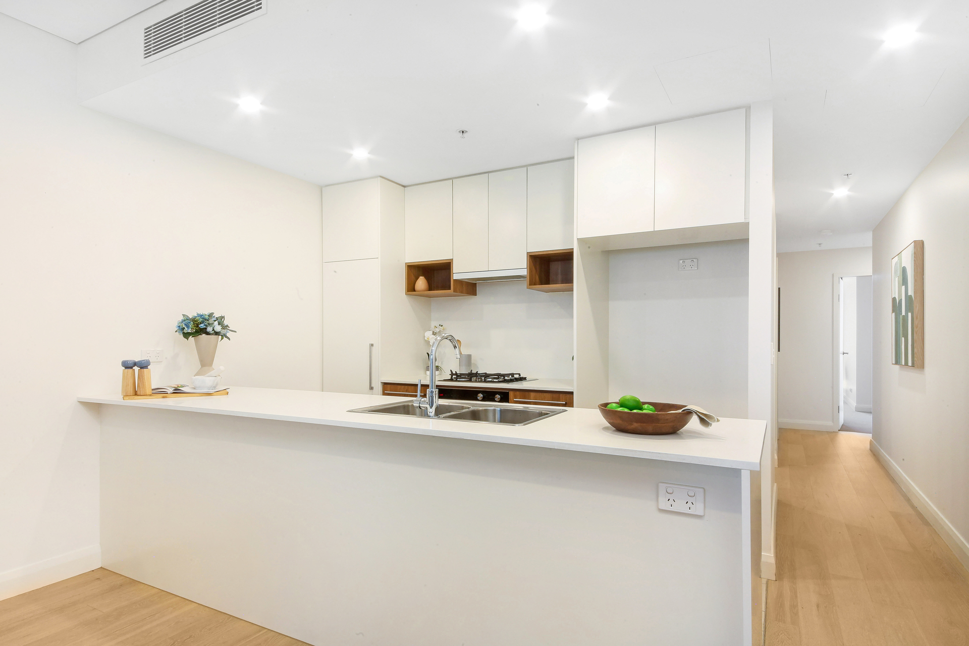 -Full size sovereign spatial kitchen for all apartments completed with Caesar stone benchtop and splashback.