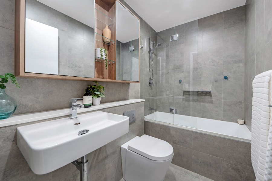 • The stylish bathroom has floor-to-ceiling tiles and a combined bath/shower.