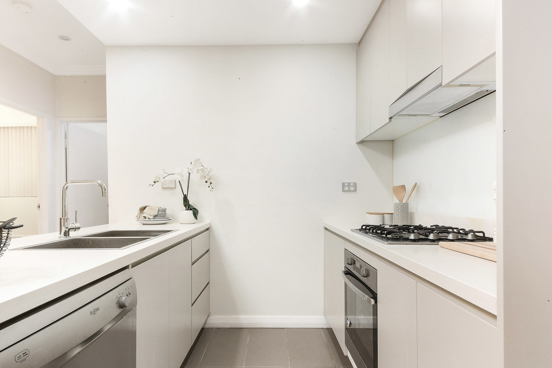 – Gourmet gas kitchen with stone benchtops, oven, and dishwasher
