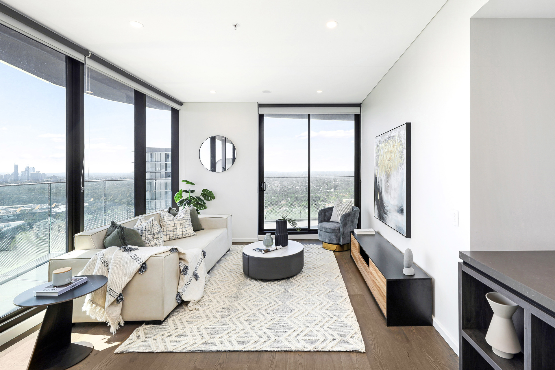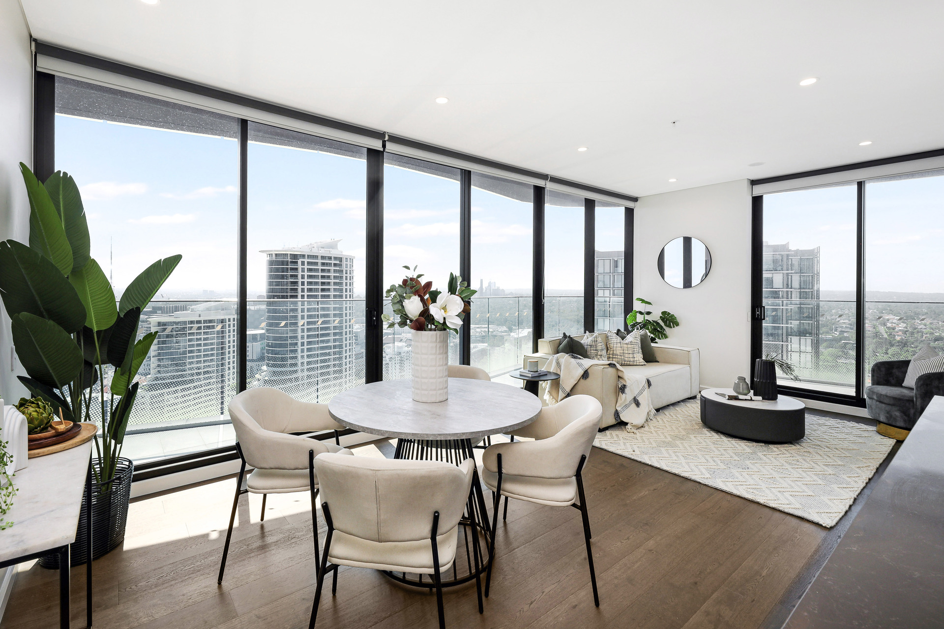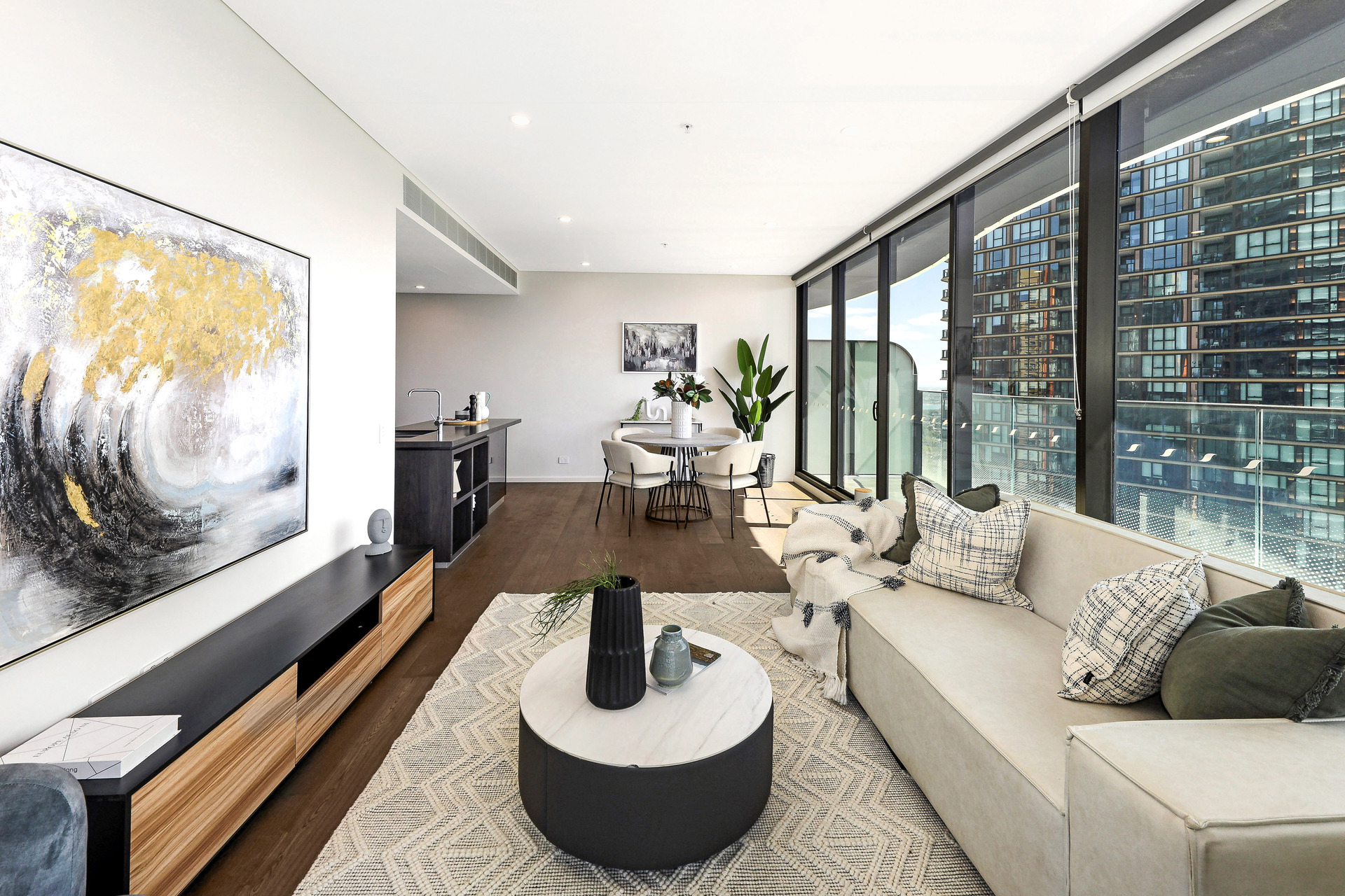 Open-plan living and dining areas with expansive glass doors