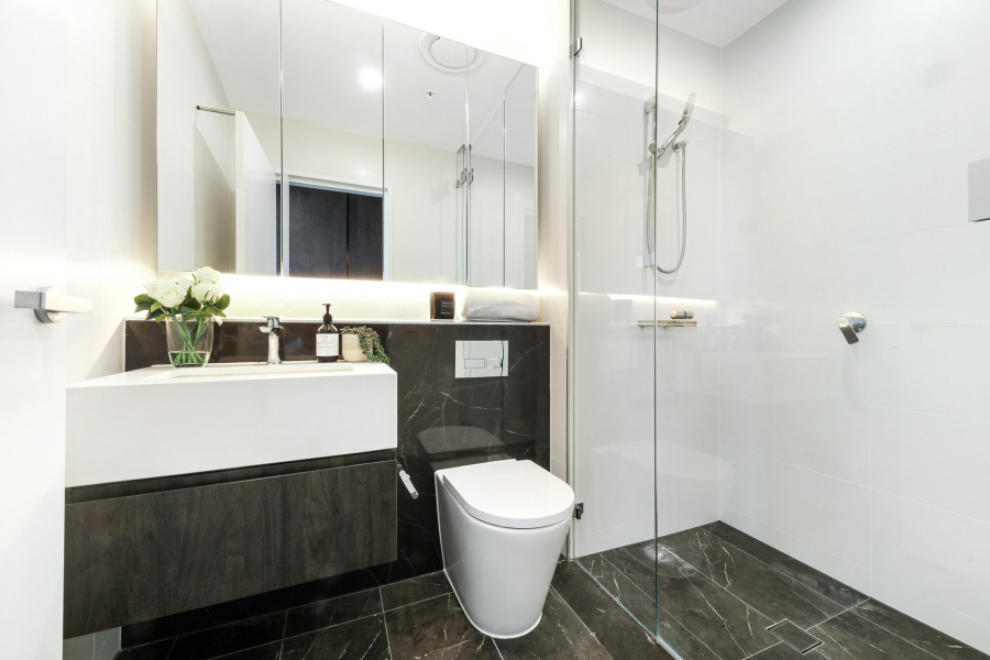 Stylish marble-inspired bathrooms and two generous bedrooms